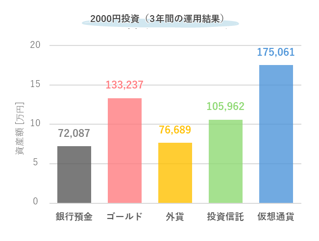 5つの異なる金融資産(銀行預金、ゴールド、外貨(FX)、投資信託、仮想通貨)を、毎月2000円ずつ、合計1万円を購入するといったシンプルな投資です。