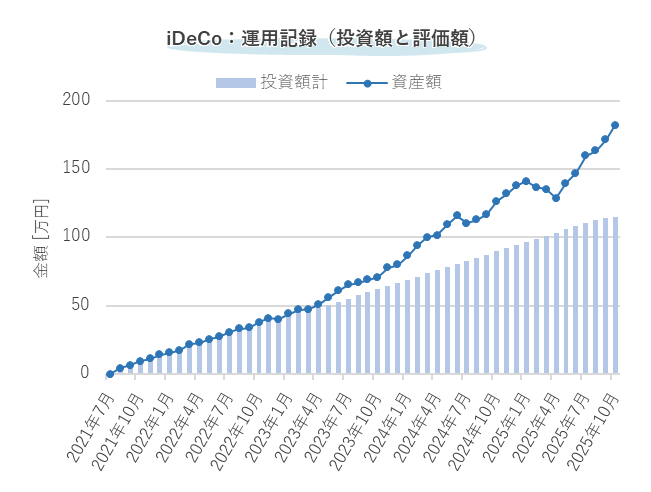 2025年10月現在、合計で115.1万円を入金して、資産は181.8万なので、運用益は66.7万円のプラス!